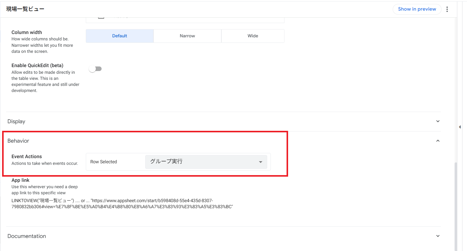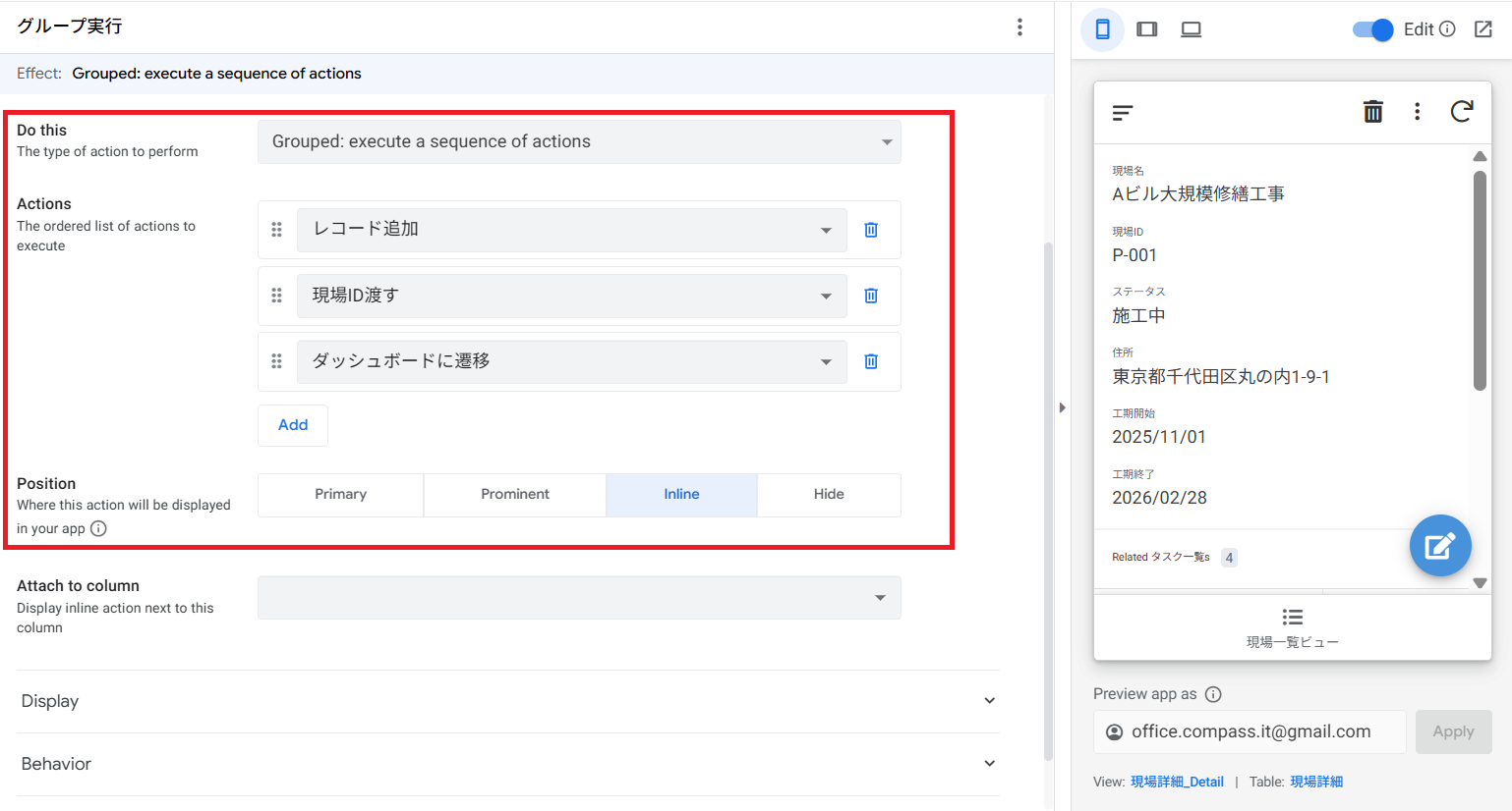 最後に、現場一覧ビューのBehaviorのEvent Actionsに「グループ実行」を設定したら、終了です。