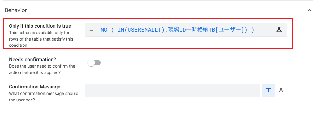 FILTER(現場ID一時格納TB,[ユーザー]=USEREMAIL())これは、ログインしているユーザーIDとユーザーカラムに格納されているユーザーIDが一致した行を対象にする、という意味です。