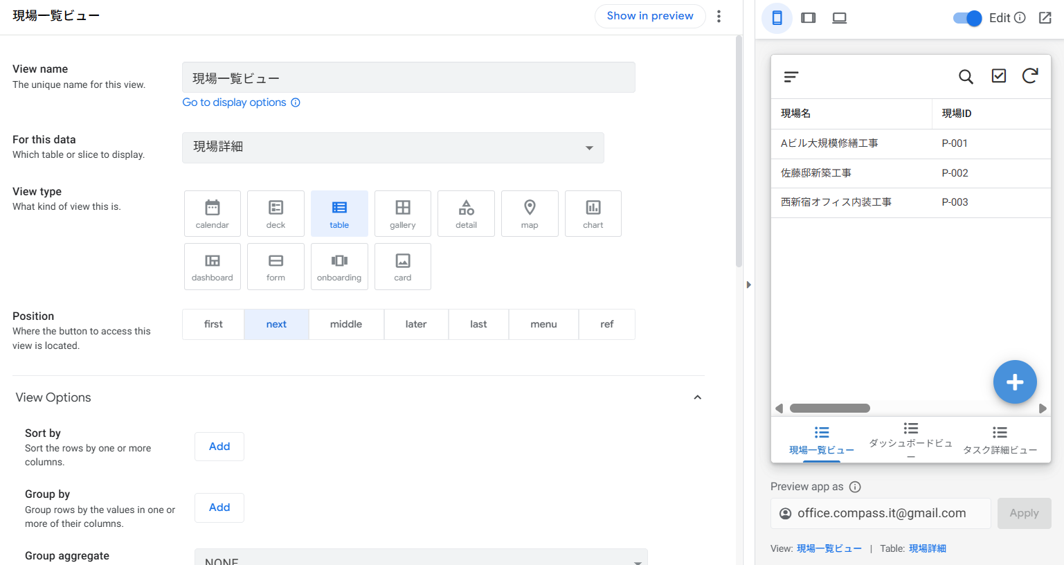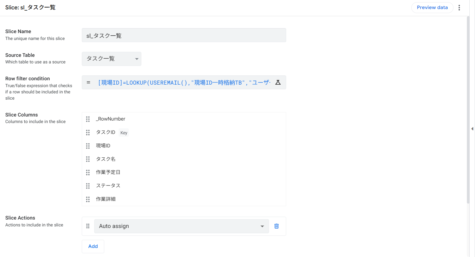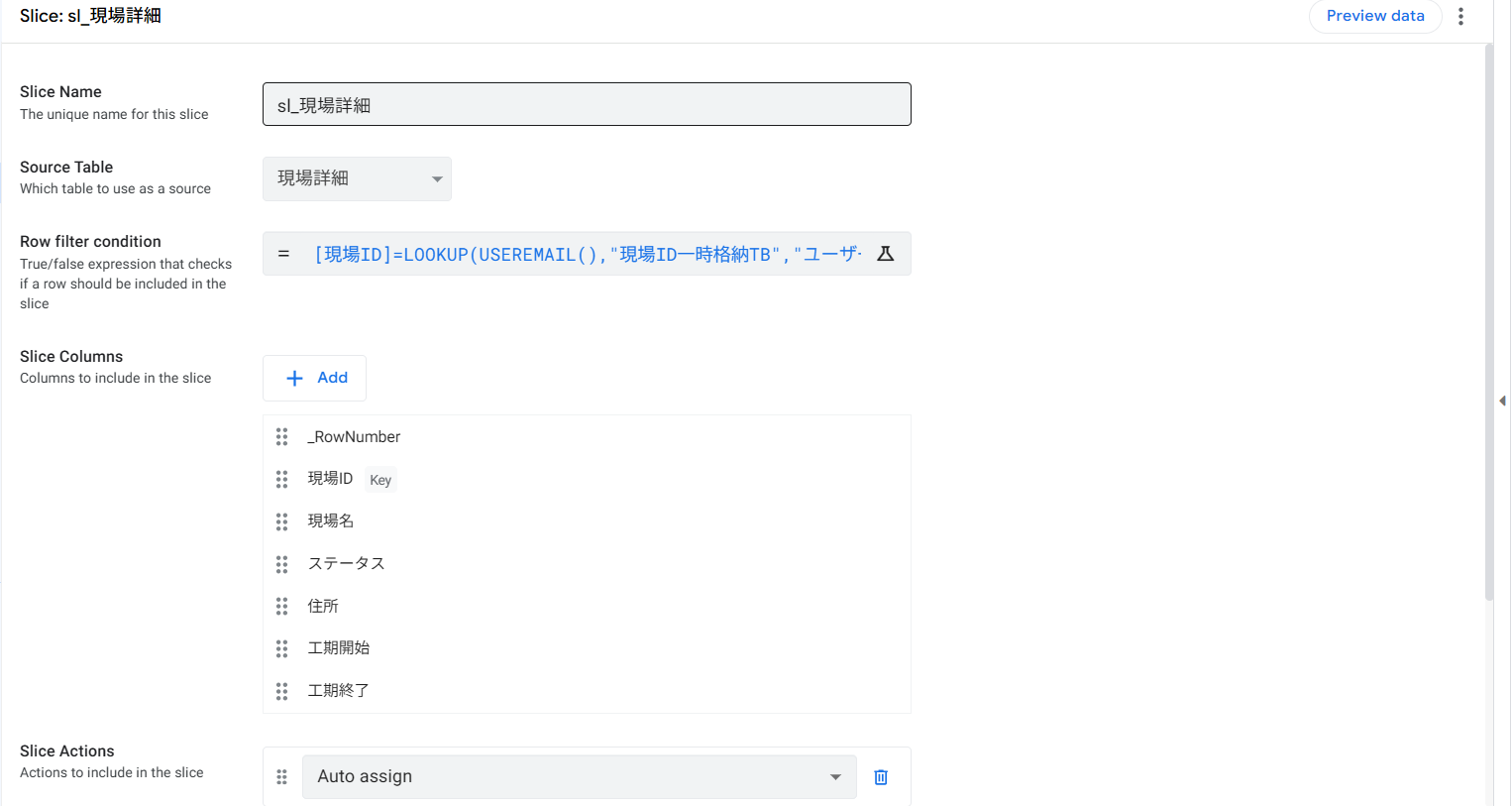 [現場ID]=LOOKUP(USEREMAIL(),"現場ID一時格納TB","ユーザー","現場ID")- sl_現場詳細
