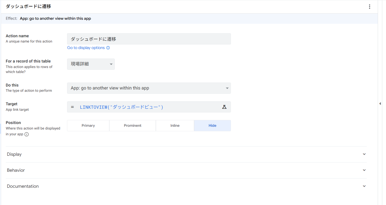現場一覧ビューのクリック時にアクションを発火するので、Positonを「Inline」に設定します。
