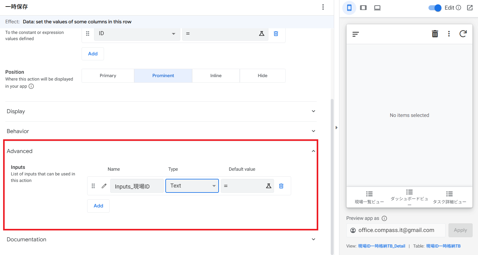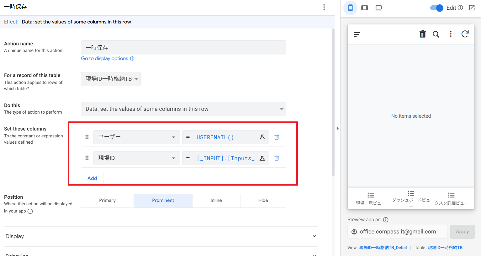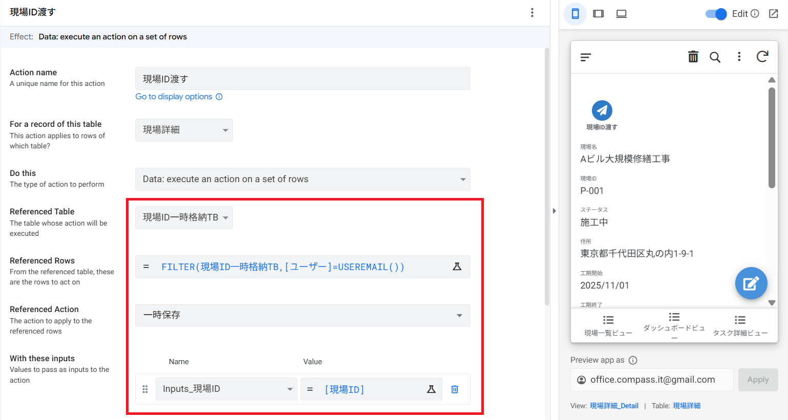 [_INPUT].[Inputs_現場ID]また、ユーザーカラムには現在のログインユーザーが入るため、USEREMAIL()を設定します。