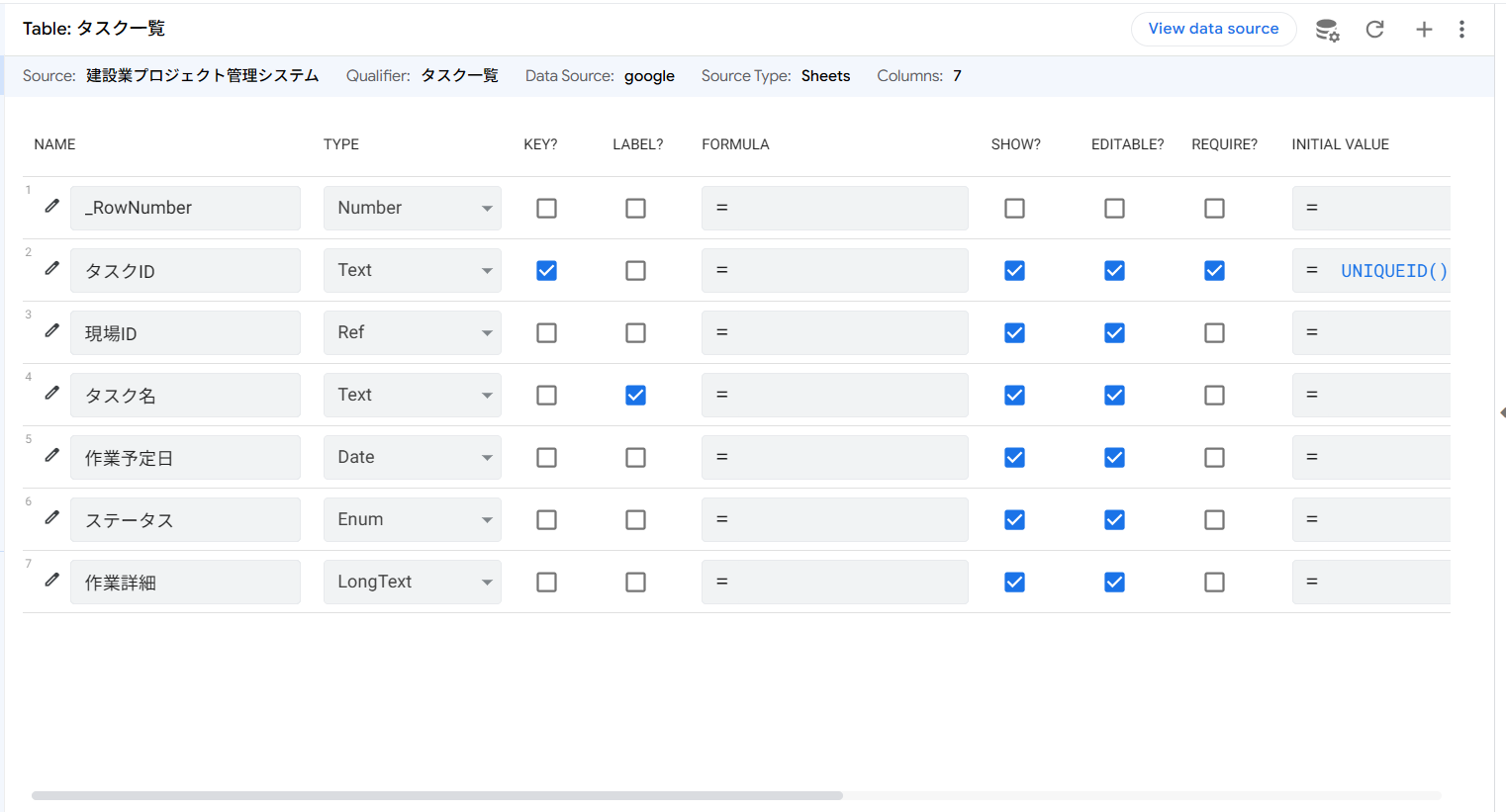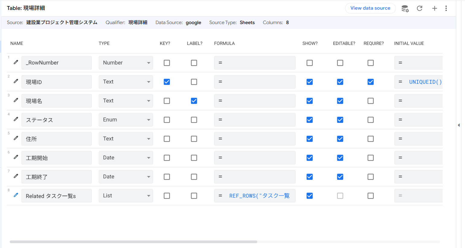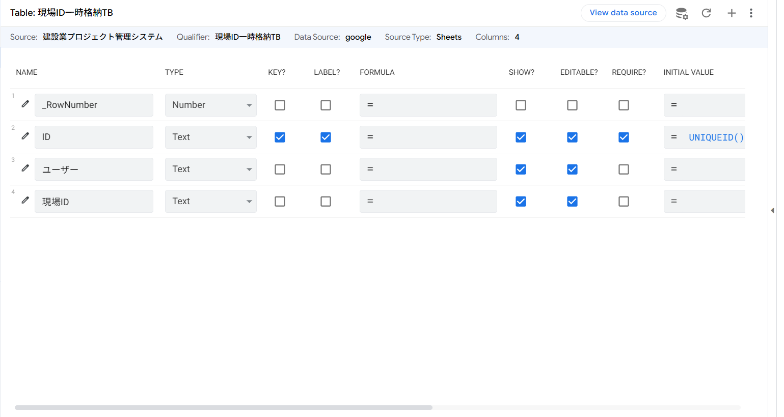 [_INPUT].[Inputs_現場ID]また、ユーザーカラムには現在のログインユーザーが入るため、USEREMAIL()を設定します。