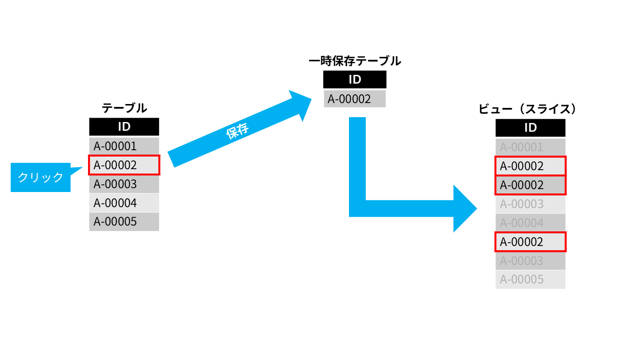 一時保存テーブルに格納されている現場IDと、各テーブルの現場IDが一致する行のみを表示するスライスを作ります。