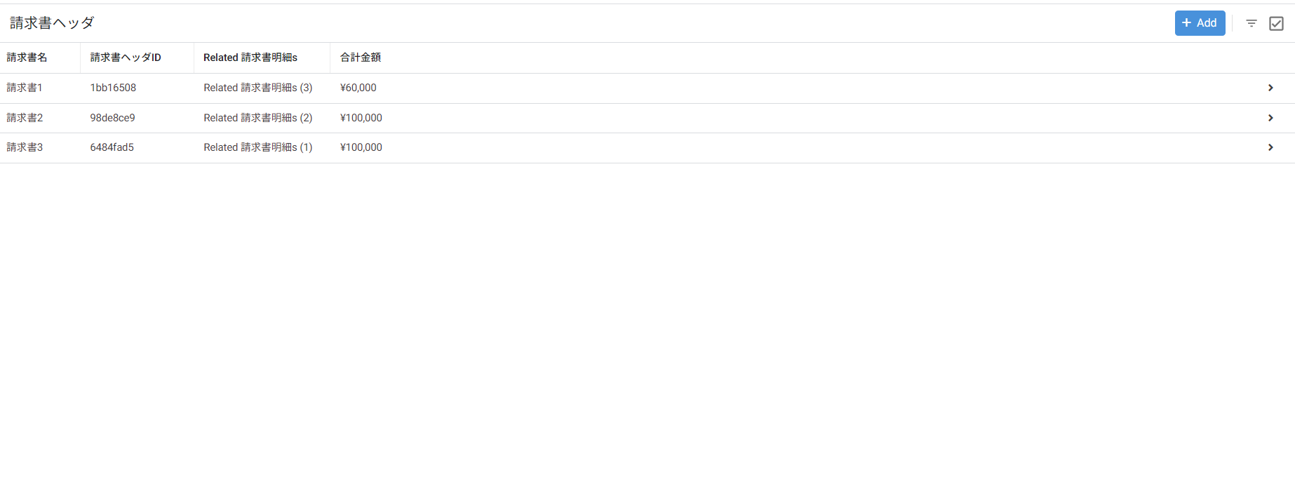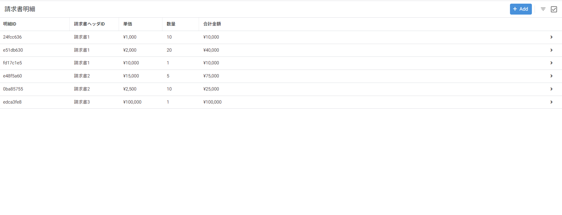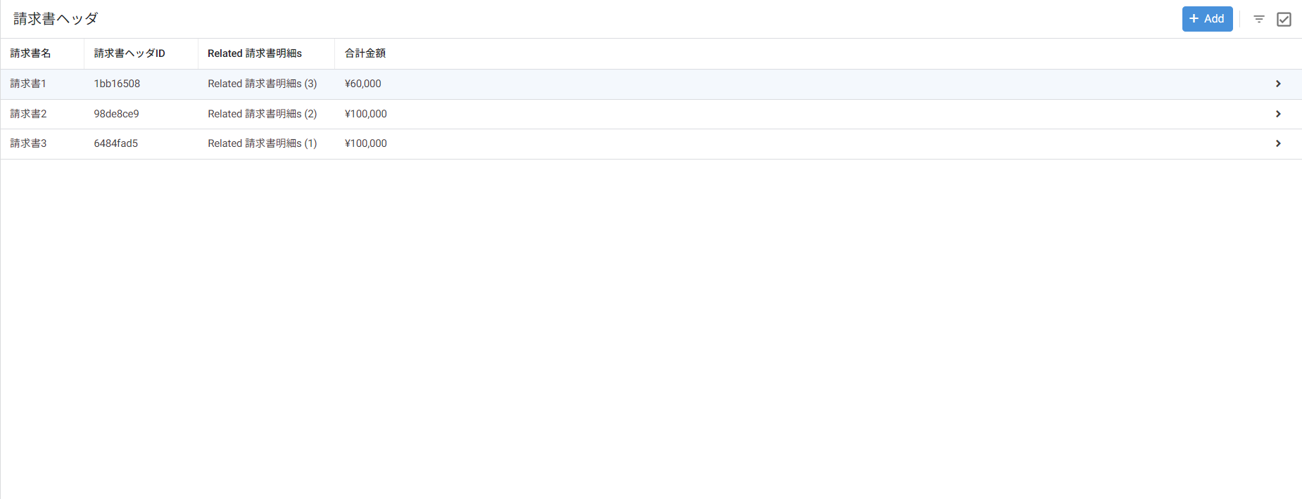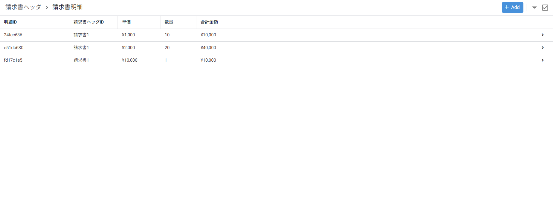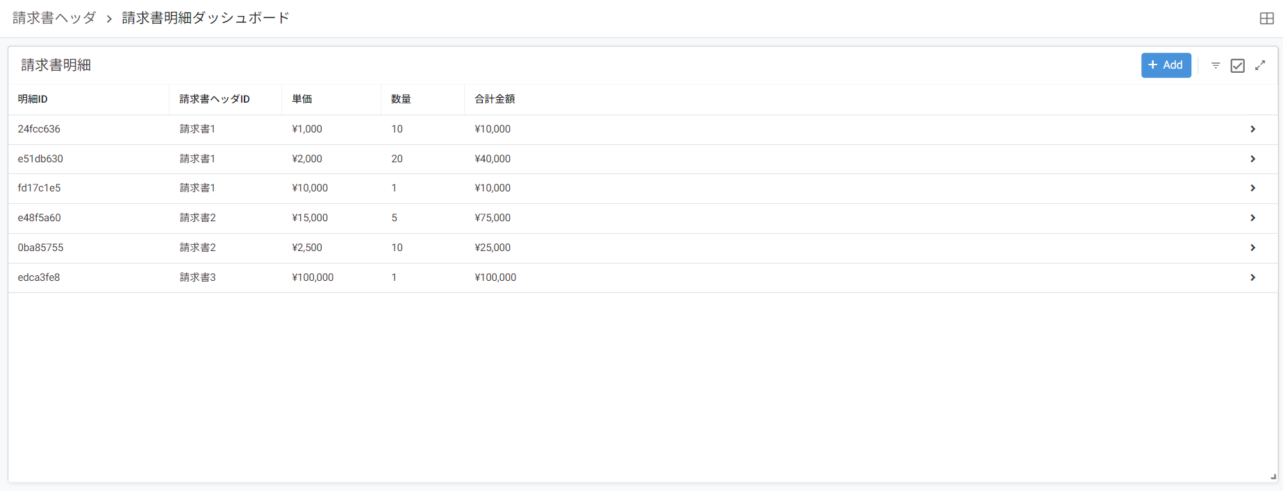 )請求書1をクリックすると、請求書明細Viewに遷移して、請求書1の請求書ヘッダIDを持っている明細のみが表示されます。