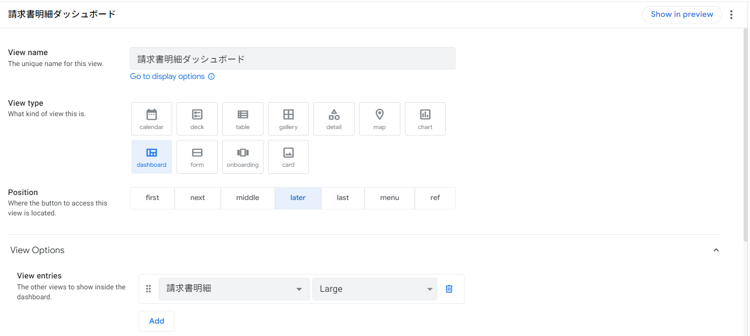 実例では、請求書明細Viewのみをダッシュボードに含めています。