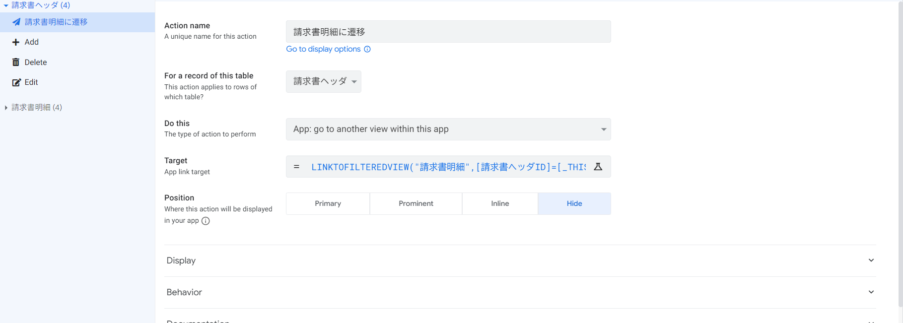 LINKTOFILTEREDVIEW() を使って、請求書ヘッダをクリックした際に、そのヘッダIDに紐づく明細のみを表示するアクションを設定します。