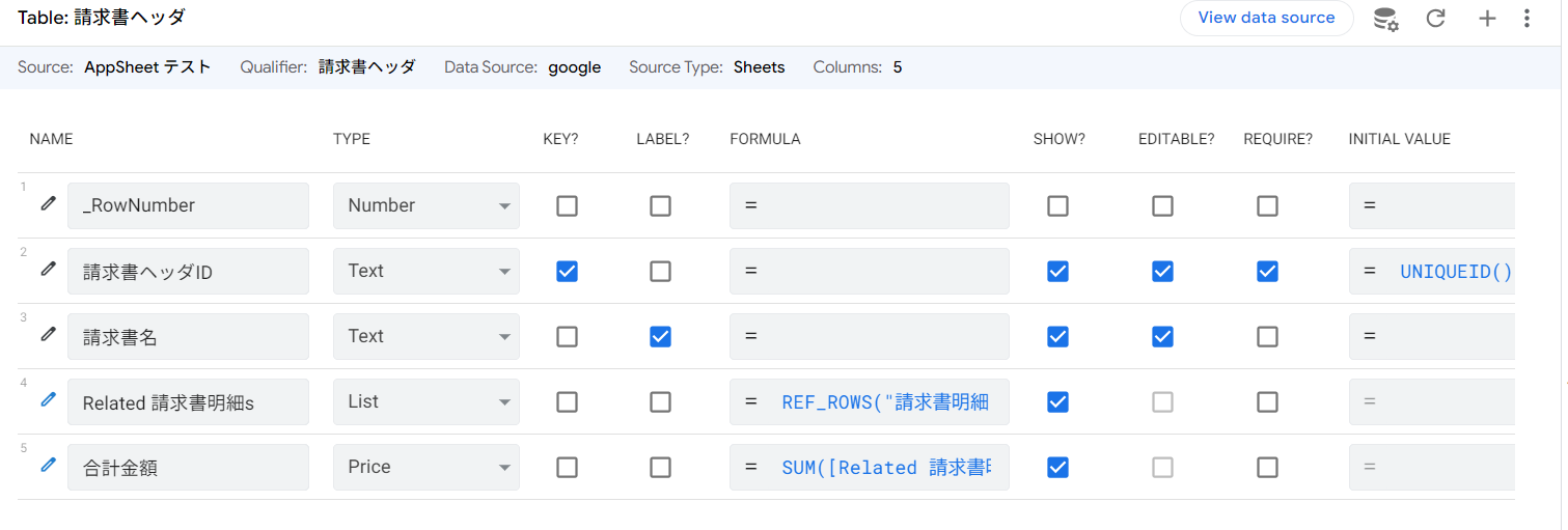 請求書明細側が請求書ヘッダIDを参照し、請求書ヘッダで明細の合計を出します。