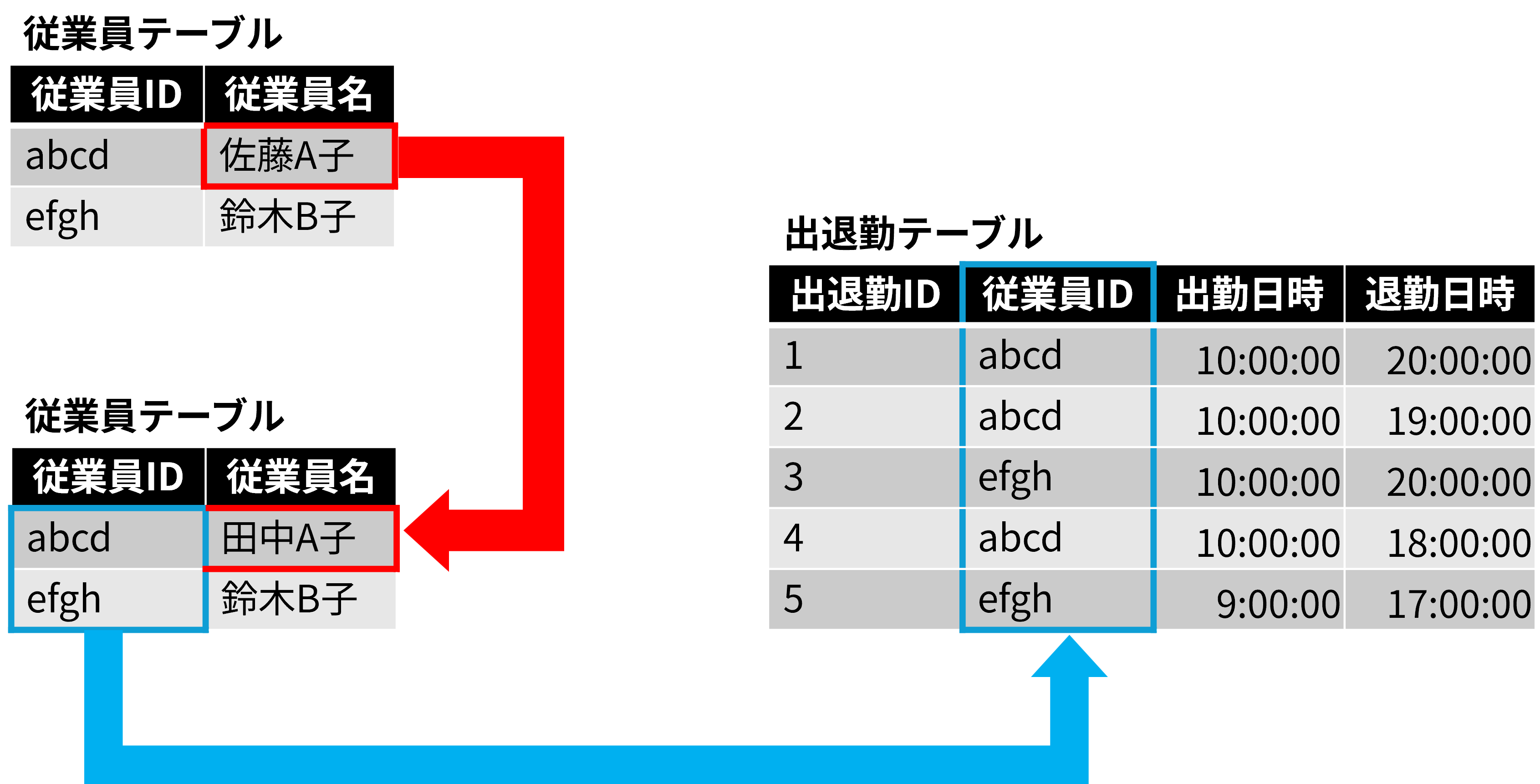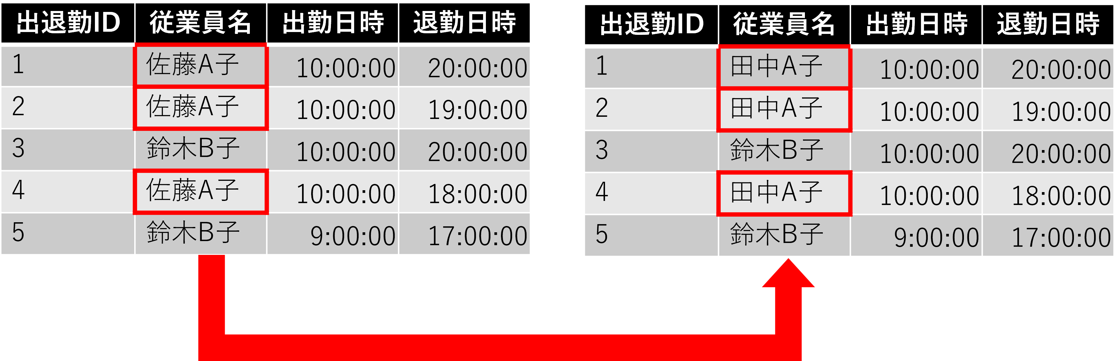 そうすると、従業員IDで二つのテーブルが結びついているため、従業員名をひとつ変更すれば、出退勤テーブルを一行ずつ変更する必要はありません。