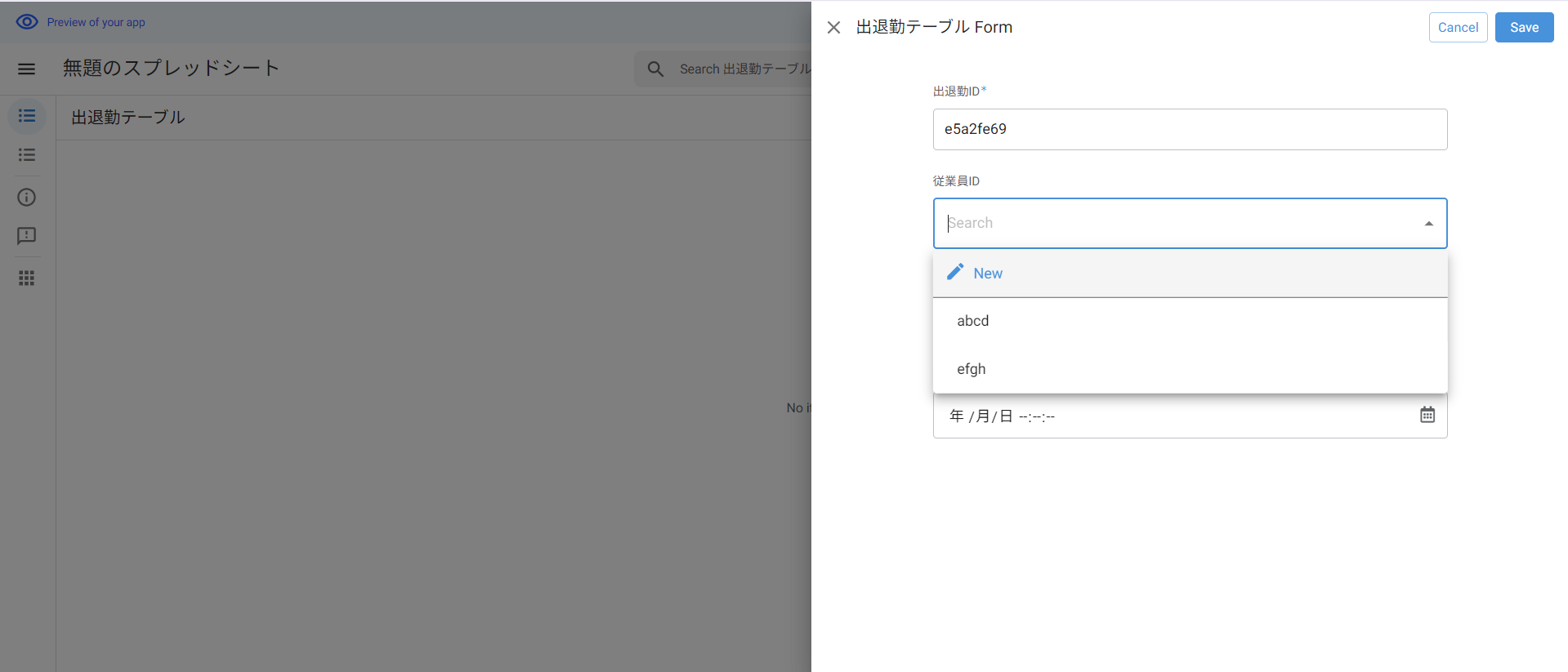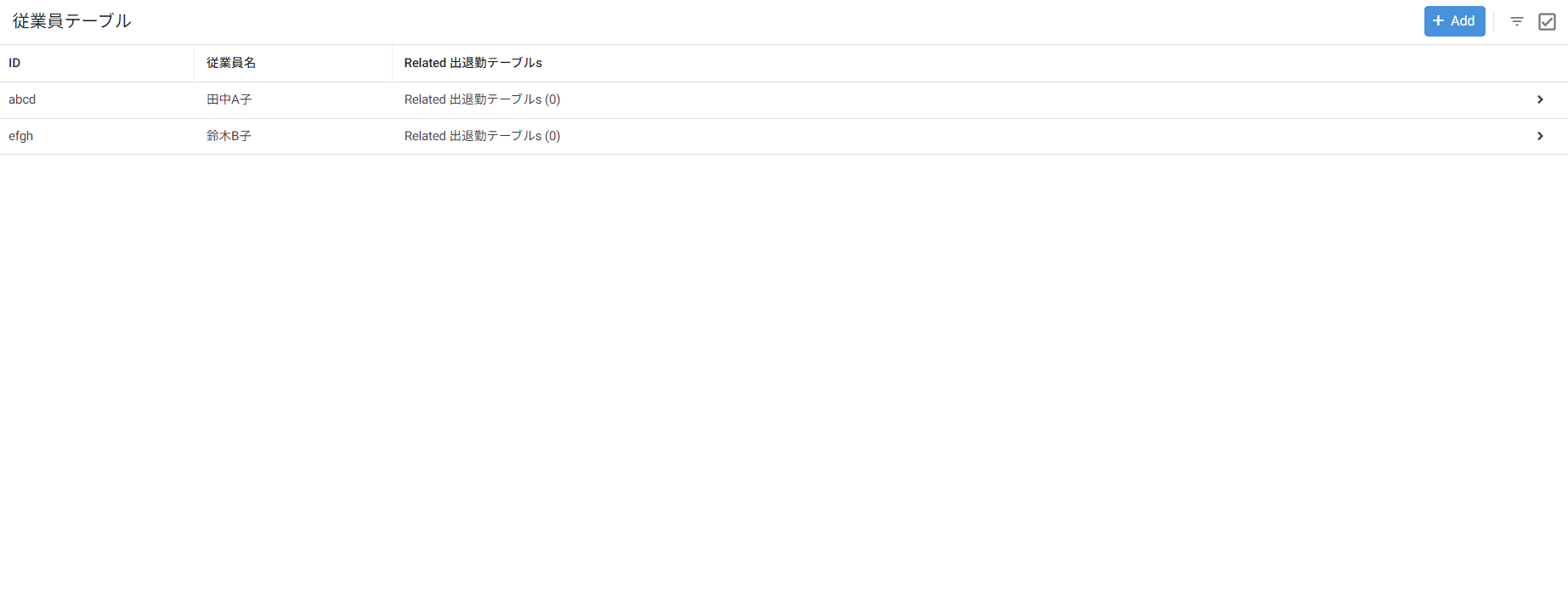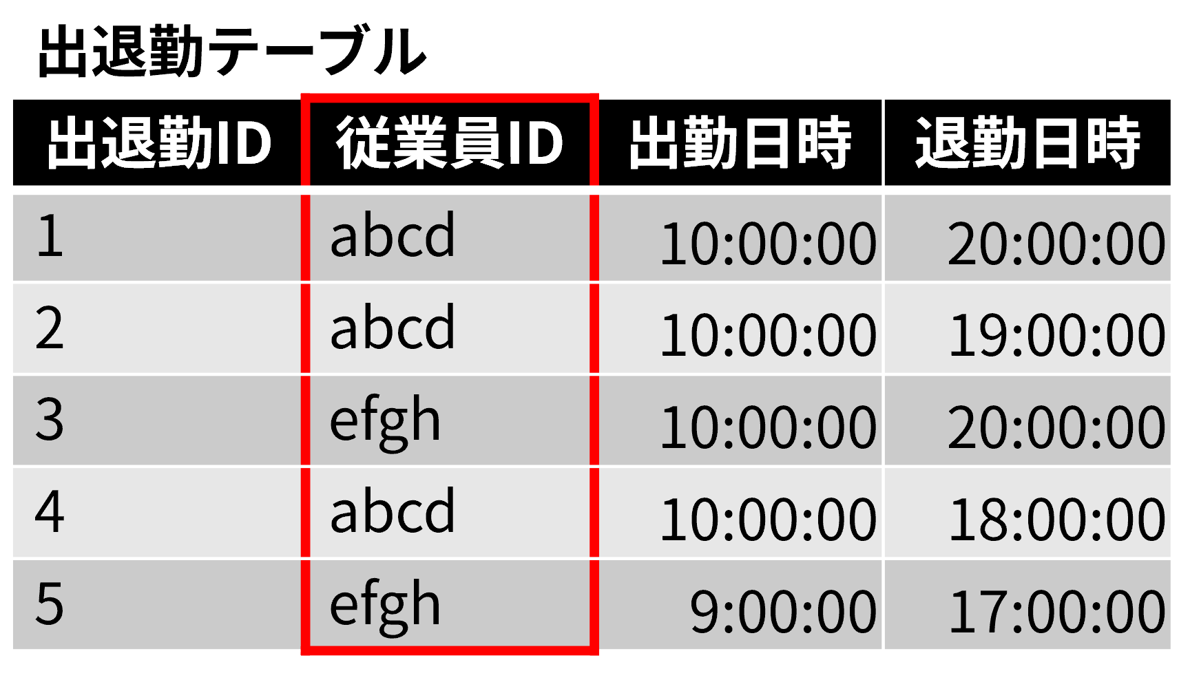 これにより、「出退勤テーブルにある従業員IDは、従業員テーブルのIDと結びついているよ」ということをシステムにもわからせることができます。