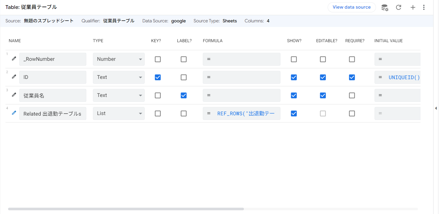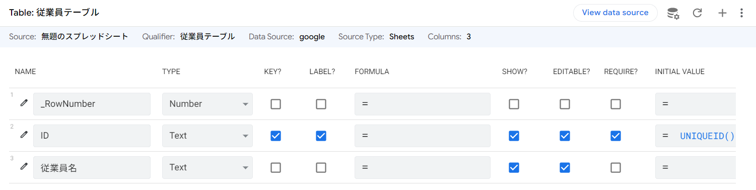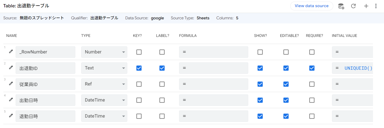 では、ここでAppSheetの画面で先ほどのテーブルを再現します。