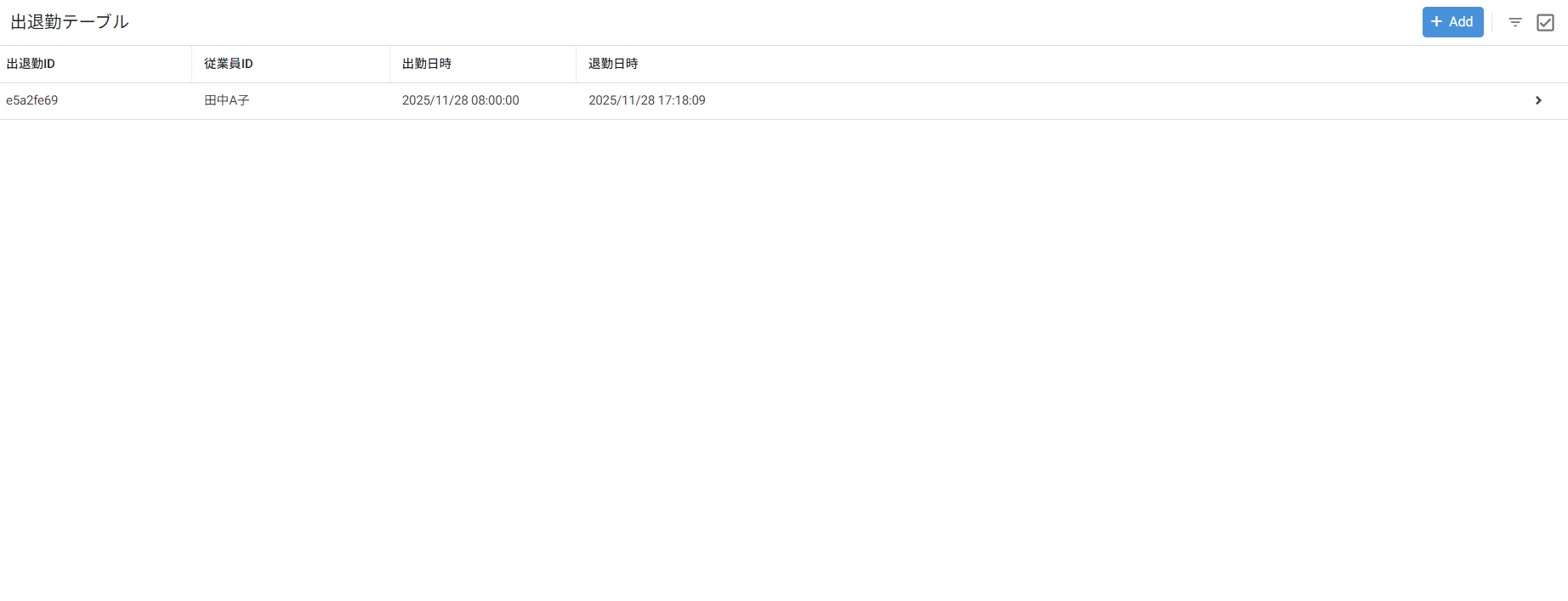 従業員が出勤したら出勤時間を記録し、退勤したら退勤時間を記録するというシンプルなテーブルです。